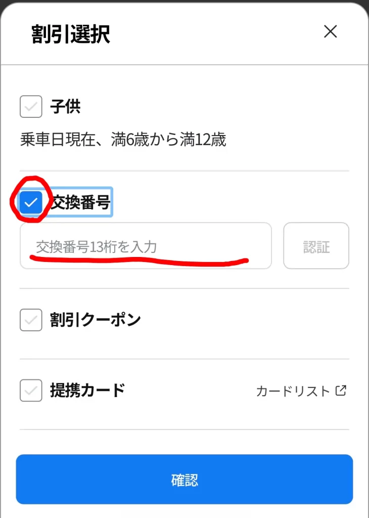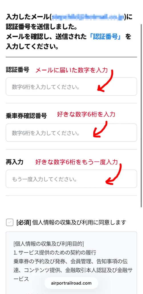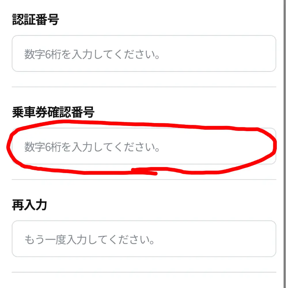 - 「乗車券確認番号」は6桁の好きな数字を入力