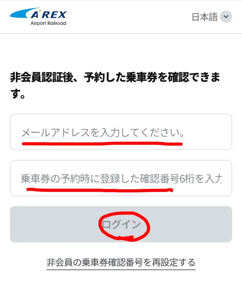 座席予約時に利用した「メールアドレス」と「確認番号(6桁)」を入力し、ログインボタンをタップします。