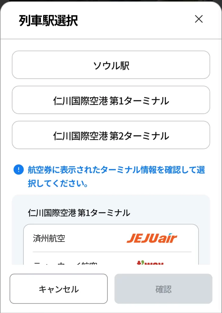 「第1ターミナル」「第2ターミナル」どちらかを選びましょう。(ソウル駅→空港も選べます)
