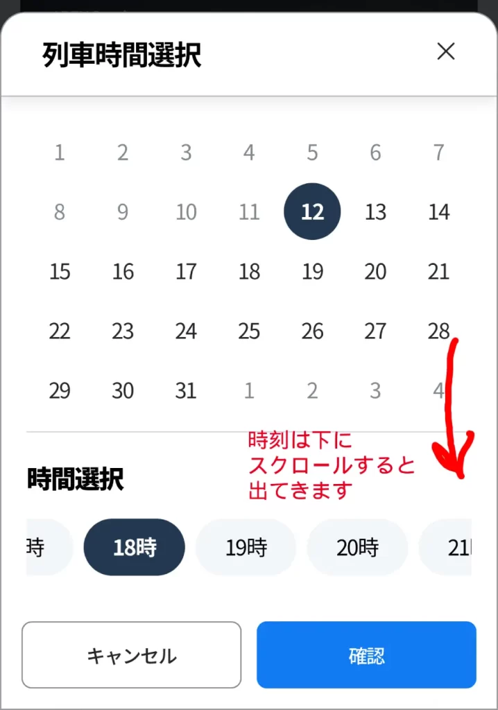 乗車時間はあとで選択できます。一旦、ざっくりの時間を選んでおきましょう!