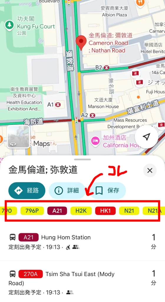 路線図でも確認できますが、やや見づらいので、合わせてgooglemapで確認するのがおすすめです。バスマークをタップして、下にスクロールすると、停まるバスのナンバーが確認できます。