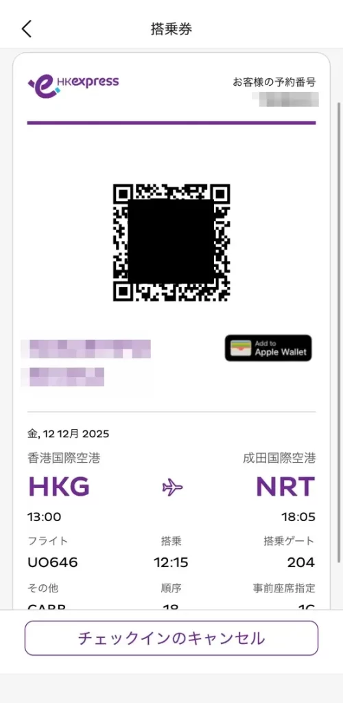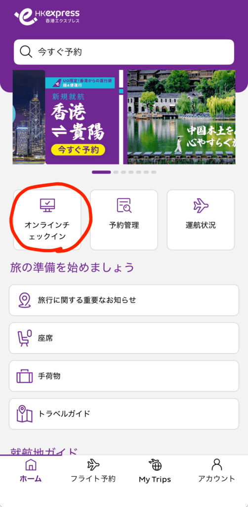 香港エクスプレスの公式サイト以外(Trip.com等)から予約した場合でも、アプリからオンラインチェックインができますよ。