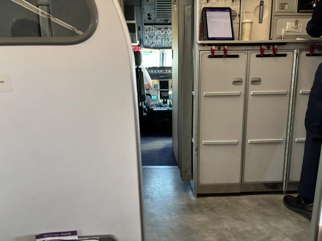 私が予約したのは「最前列の通路側」だったのですが、客室乗務員の出入りが普通に座っていて目に入ります。