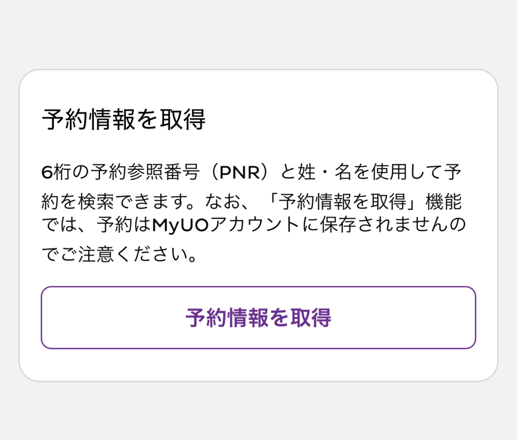 予約情報取得の画面になるので、Trip.com等で発行された6桁の予約番号と、姓名(パスポート表記)を入れましょう。