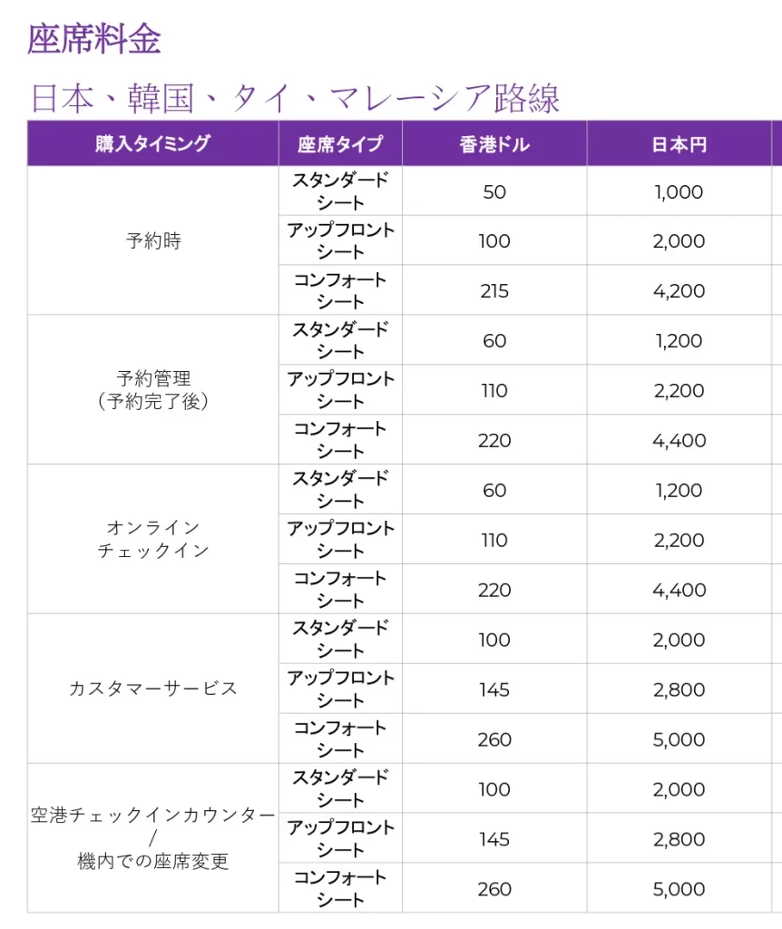 香港エクスプレスの座席指定料金は「いつ座席指定するか」×「座席タイプ」によって変わります。