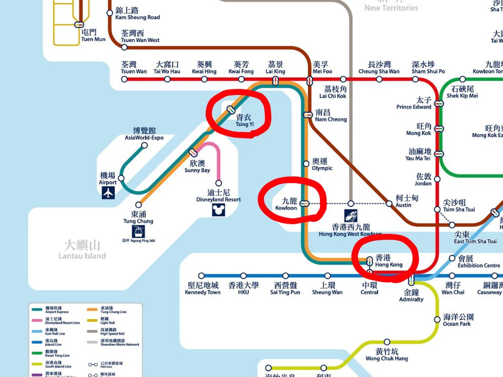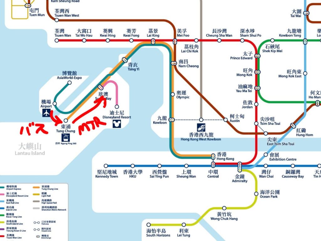 現在空港からMTRは出ていないので、バスで空港に一番近い「東涌駅」までバスで行き、そこからMRTを乗り継いで行く方法です。
