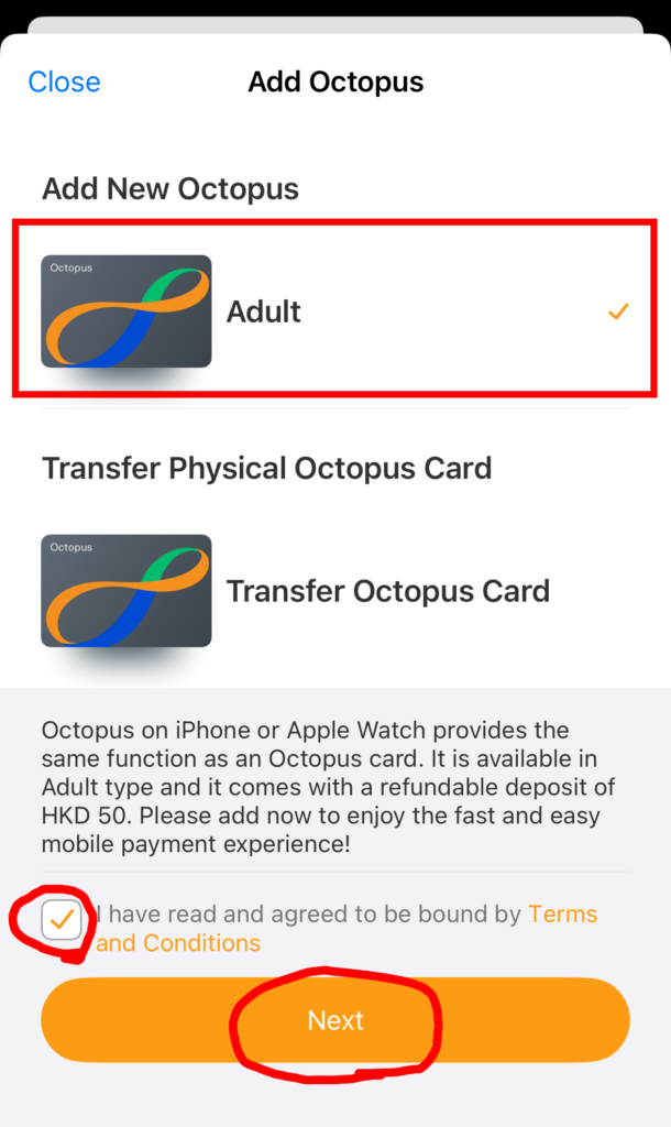 カードの種類を選択します。「Adult」を選び、チェックを入れて「Next」をタップ。
