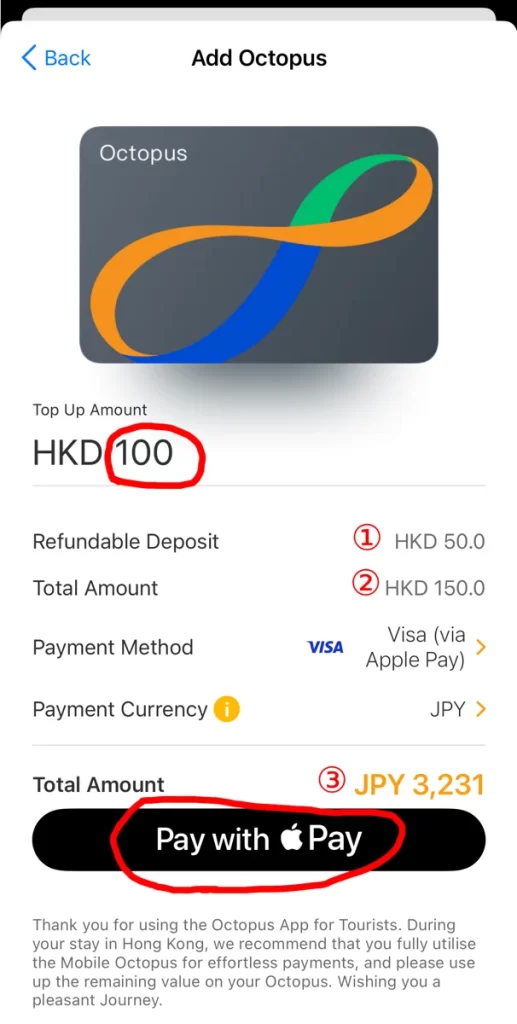 「①香港ドルのチャージ金額」は、最低100HKD(2,036円)からです。