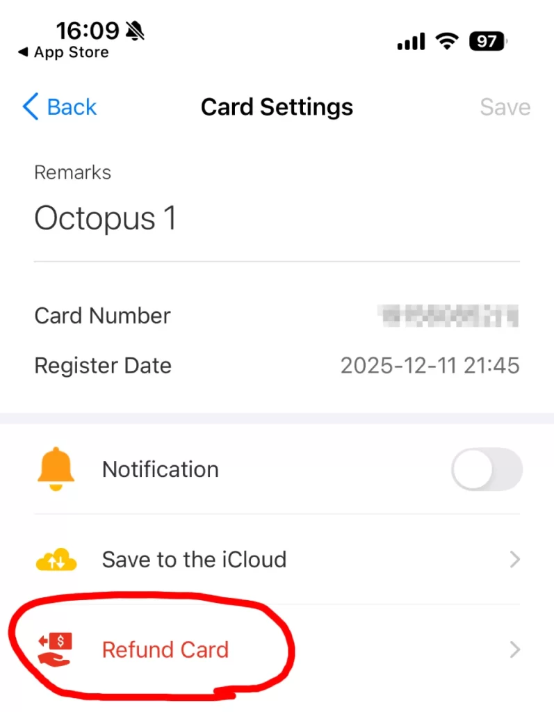 「Refund Card」をタップします。
