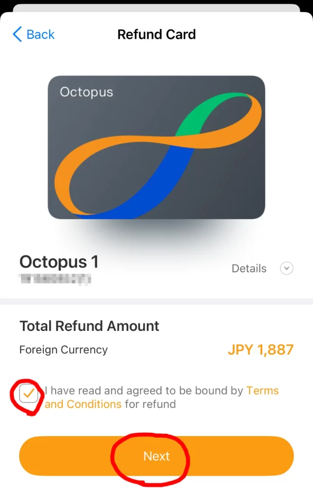 返金額が日本円で出てきます。確認後、チェックを入れて「Next」をタップ。