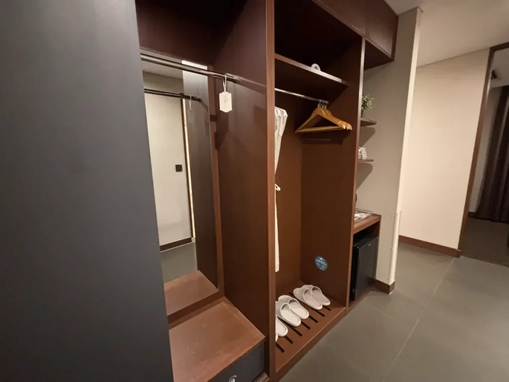 入口入ってすぐの場所に「荷物置き」「ハンガー」「バスローブ」「スリッパ」があります。(その隣に冷蔵庫)