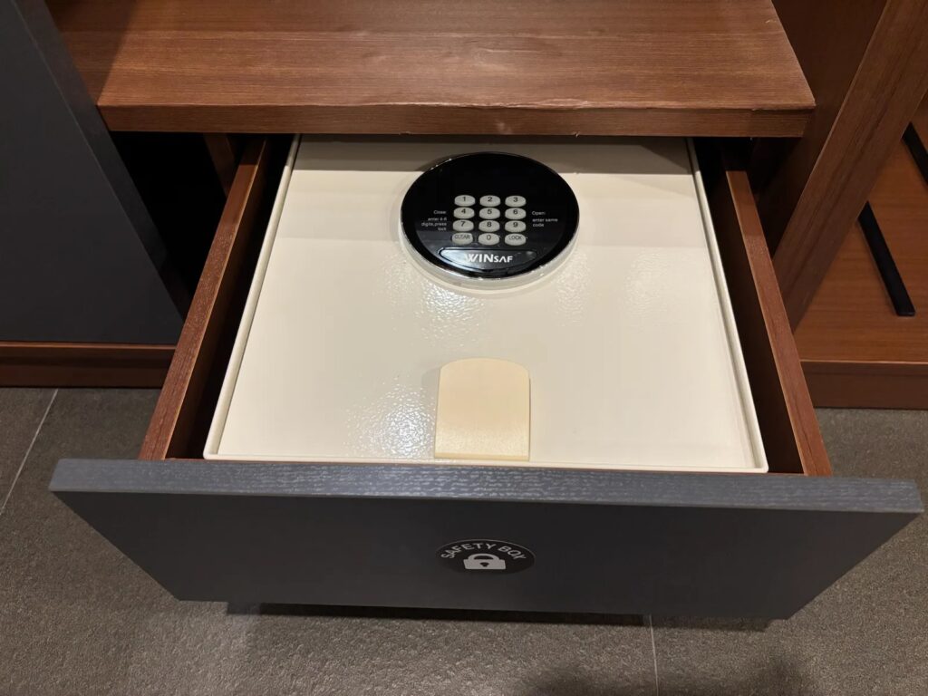 頑丈なセキュリティボックスは手前の荷物置きの下にありました。