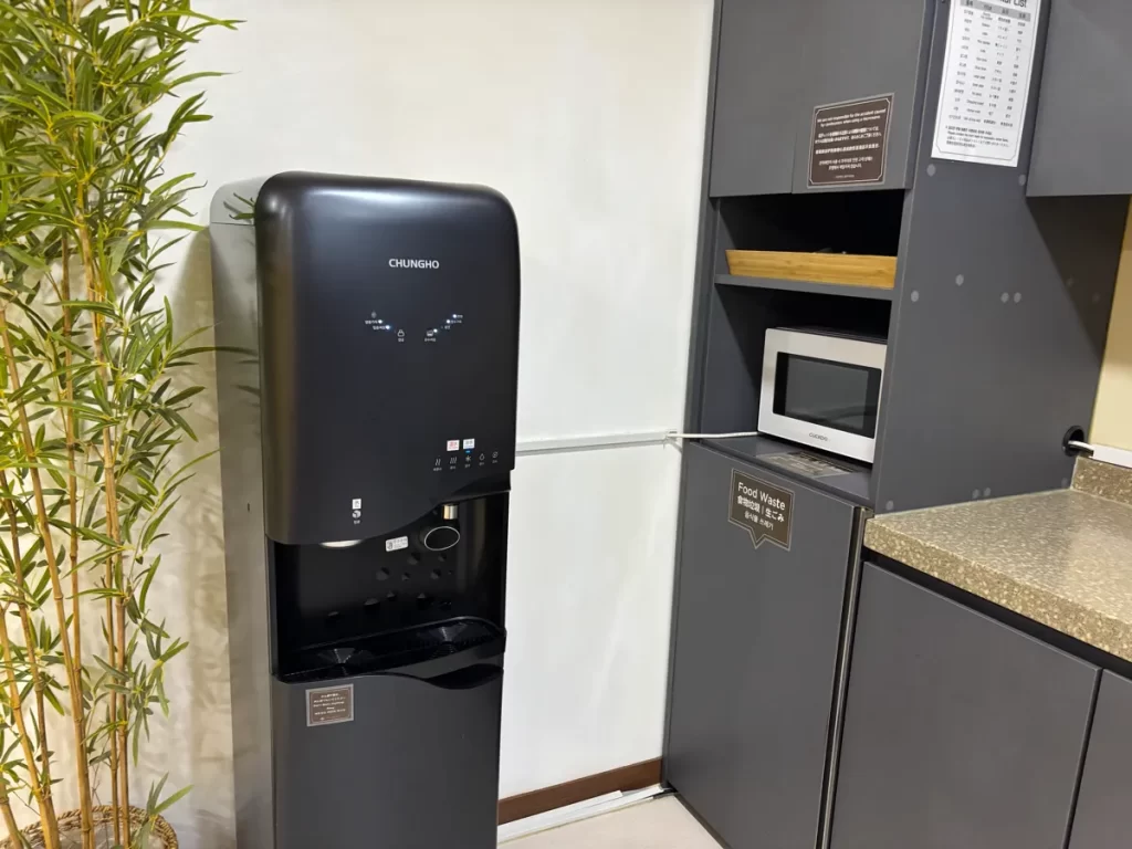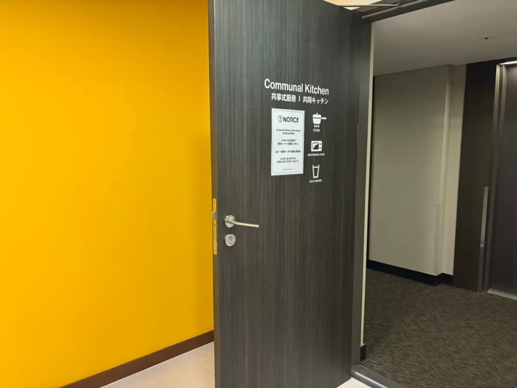 見つけました、共用キッチン。館内は日本語表記が多くて助かりますね。