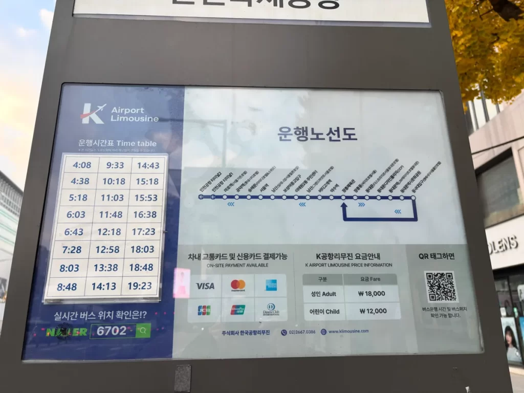 帰りの仁川空港行きのバスの時刻表です。(東大門歴史文化公園のバス停です)