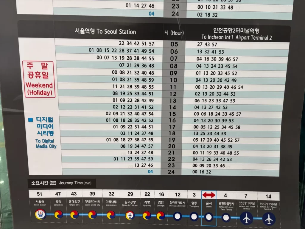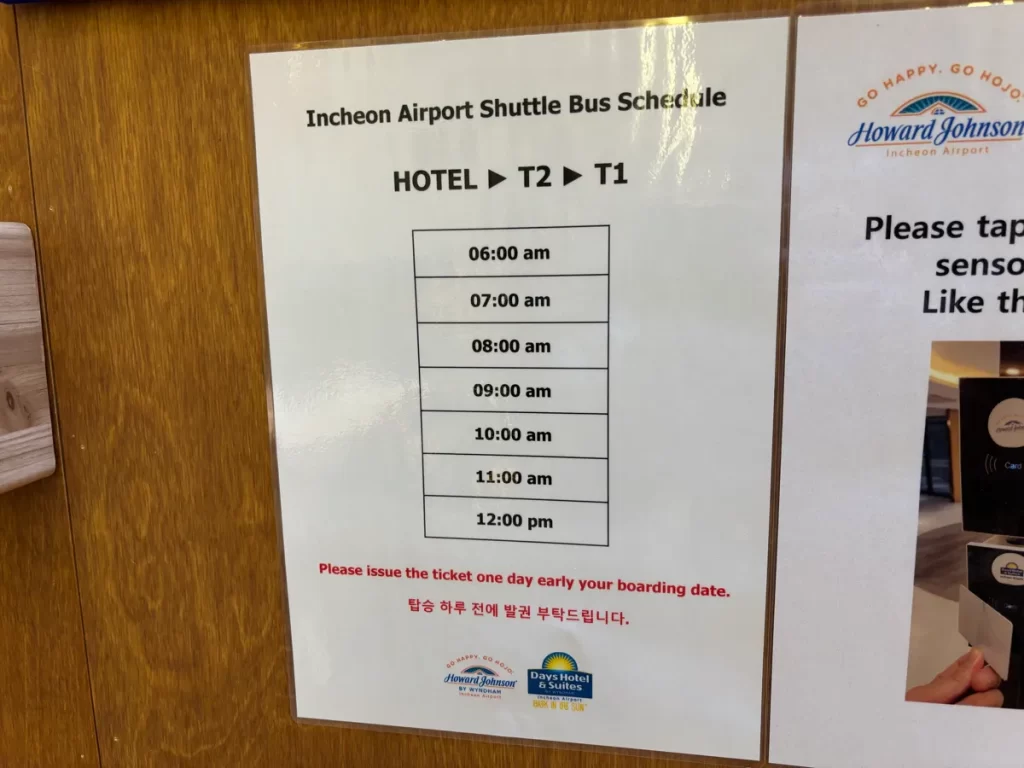 ハワードジョンソン仁川から仁川空港行きのシャトルバスの時刻表です。