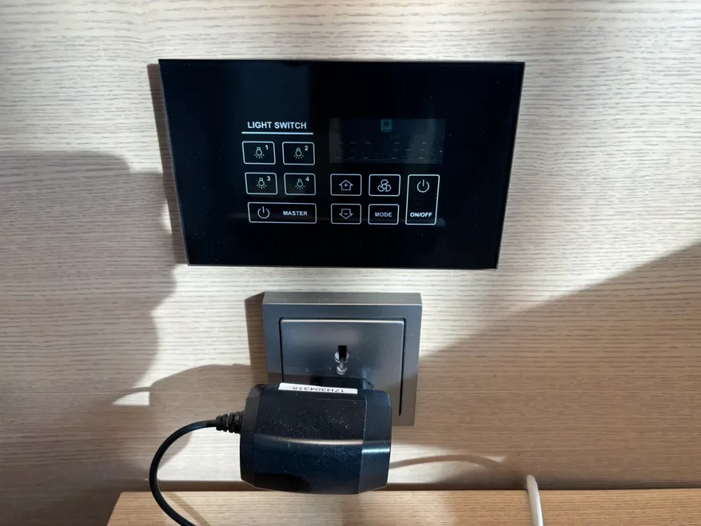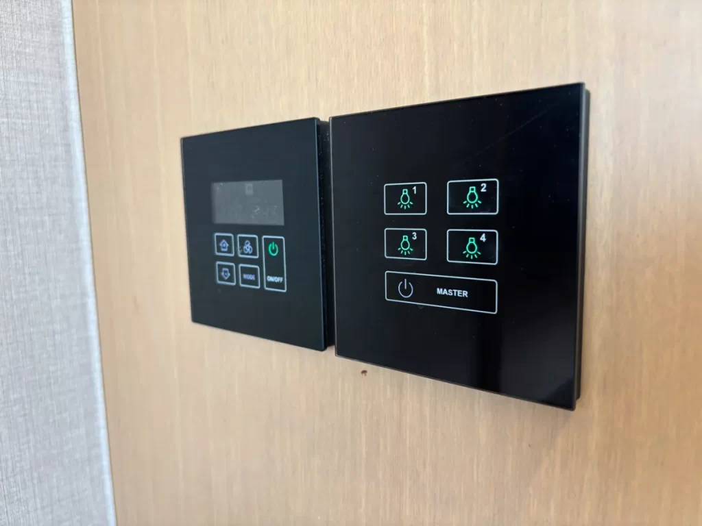 壁際にエアコンスイッチと電気のコントローラーがあります。