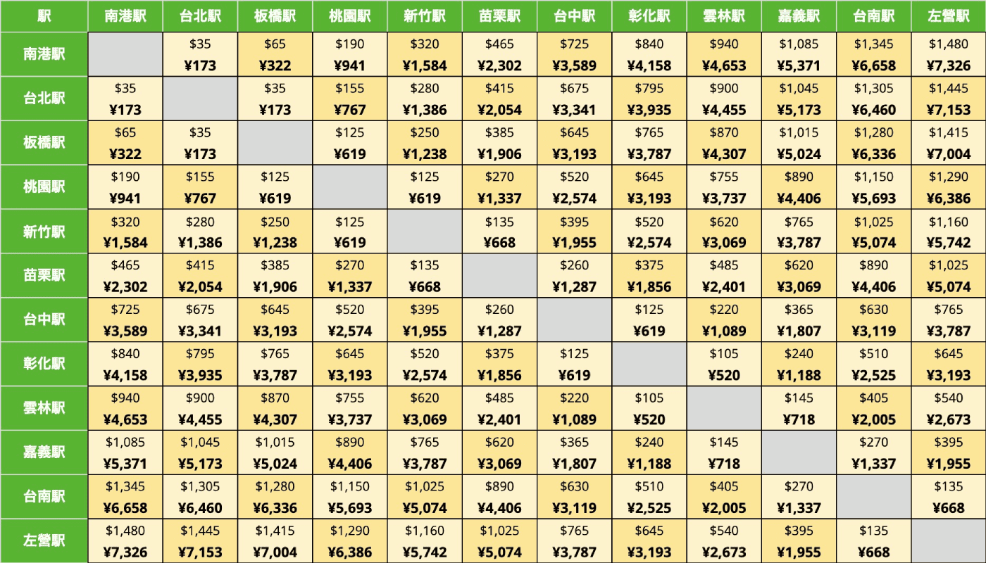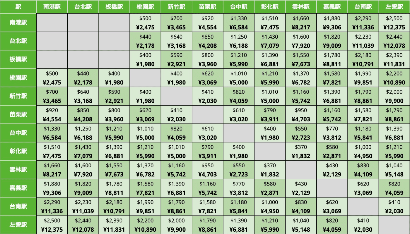 まず最初に、台湾新幹線(HSR)の料金一覧をご紹介します。